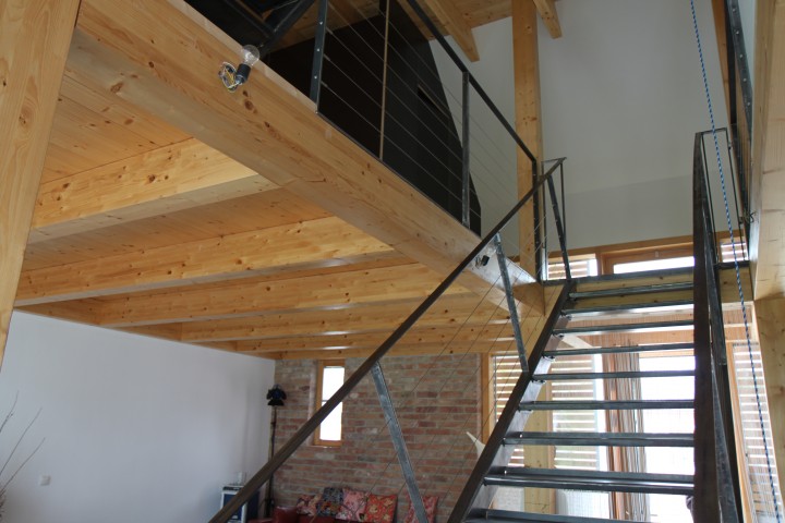 Mit seiner wohltuenden Schlichtheit integriert es sich in die gewachsene Häuserzeile. Das offene Wohnkonzept auf zwei Ebenen und der gezielte Einsatz von Tageslicht verleihen dem kompakten Innenraum Großzügigkeit, die geschlossene Baustruktur gewährt trotz großer Glasfronten Uneinsehbarkeit und Intimität. Mit den verwendeten Materialien wie Holz, Ziegel, Eisen und Stein und dem einfachen aber  durchdachten Haustechnikkonzept vereint das Gebäude gleichzeitig Innovation mit Tradition.