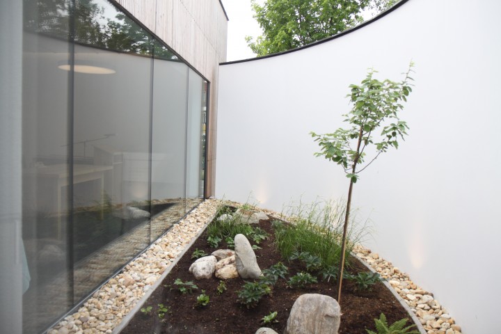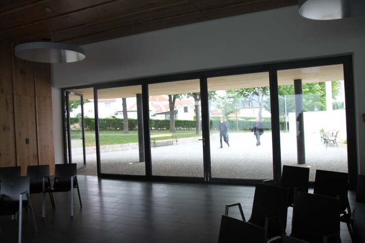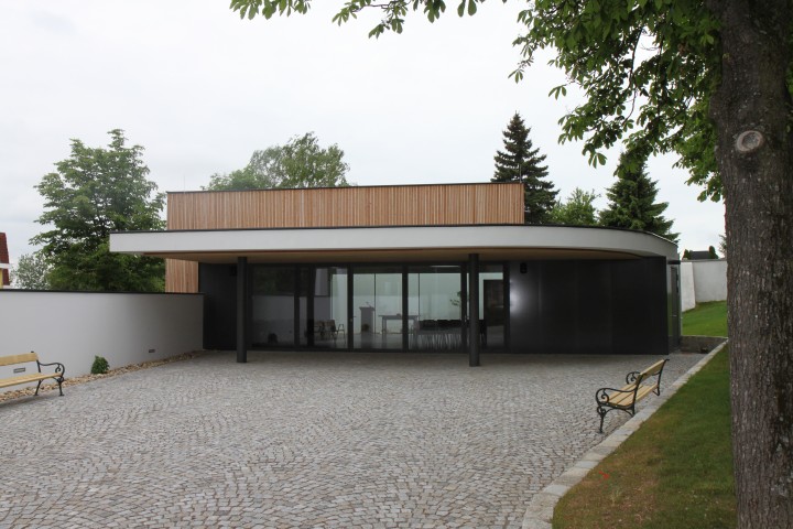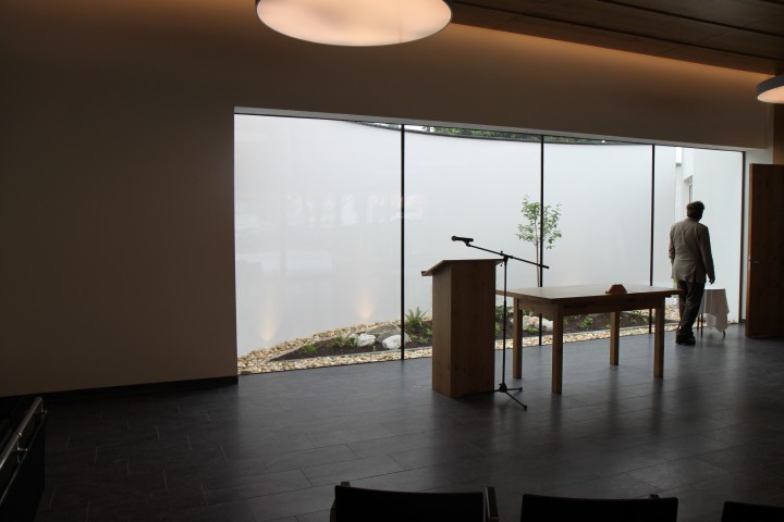 Die aus der Topografie des Ortes entwickelte Lösung, lässt einen zur Straße durch Höhenversatz abgeschirmten und so von Einblicken geschützten Vorplatz entstehen, der zum gedeckten Eingangsbereich der Aufbahrungshalle führt.