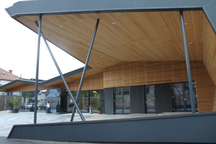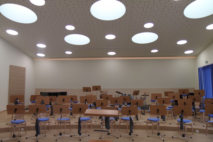 Mit tiefem Verständnis für Ort und Bauaufgabe lässt das von der Straße zurückversetzte Haus der Musik mit der Tiefenstaffelung der Außenfassade und der überdachten Freibühne ortsräumlich einen Platzbereich als neue öffentliche Ortsmitte entstehen.