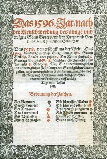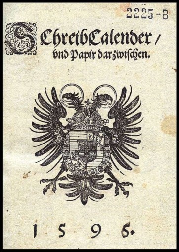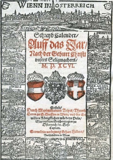 Ab der Erfindung des Buchdruckes um 1450 waren Kalender neben Bibeln die gängigsten Produkte der „Schwarzen Kunst". Im 16. Jahrhundert entstand der „Schreibkalender" mit Platz für Eintragungen auf den Seiten zwischen den Monatsübersichten. Berühmt ist vor allem der „Krakauer Kalender", der 1642 bis 1978 in 336 Jahrgängen erschien. Noch älter ist unser „Schreyb-Calender auff das Jar nachder Geburt Christi unsers Seligmachers 1596" von Maximilian Tripet, der auch durch die Stadtansichten auf dem Titelblatt besticht: neben Wien finden sich unter anderem Krems, Klosterneuburg, Wiener Neustadt, Baden, Bruck an der Leitha, Tulln und Hainburg.