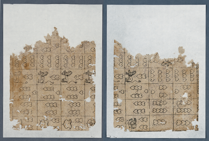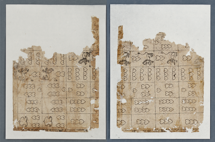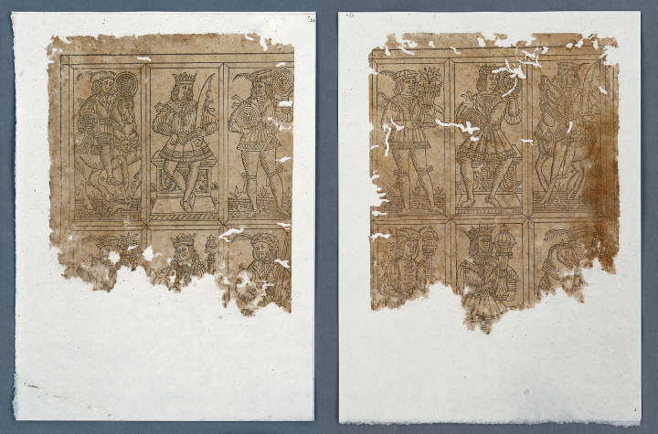 Auf den Zweiern (Daus-Karten) ist ein Löwe abgebildet, auf den Vierern ein Wappenschild. Wegen des Fehlens von Einsern (Assen) muss man auf Spielkarten mit deutschen Farben schließen (bei denen das Ass schon im Laufe des 15. Jahrhunderts verschwunden ist), wofür auch die hervorgehobene Stellung der Zweier (Daus-Karten) spricht; das Fehlen von Zehnern legt nahe, dass dieselben als „Banner-Karten“ ausgeführt waren und zusammen mit den Figurenkarten König/Ober/Unter gedruckt wurden. Sowohl die Banner-Karten als auch der Umstand, dass das vollständige Paket offenbar 48 Karten umfasste, weisen in das 16. Jahrhundert: heute sind deutsche Spielkarten nur im Umfang von 36, 33, 32, 24 (20) oder 2 x 24 (20) erhältlich; Bannerkarten gibt es heute nur mehr bei den Schweizer Farben
