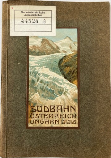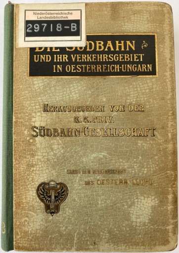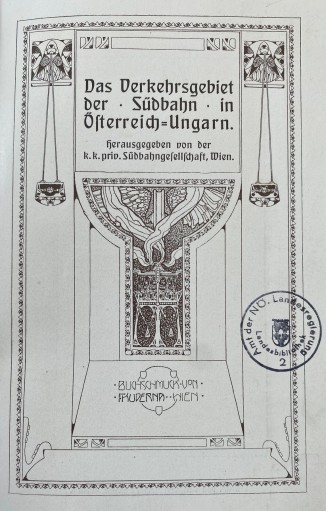 Ein weiteres Büchlein mit dem Titel “Das Verkehrsgebiet der Südbahn in Österreich-Ungarn” und mit Buchschmuck von F(ranz) Kuderna (1882-1943) aus Wien wurde von der K.K. Priv. Südbahngesellschaft herausgegeben und von Christoph Reißer’s Söhne in Wien gedruckt. Die bei dem mit dem Buchtitel verlinkten Digitalisat (der Sächsischen Landesbibliothek – Staats- und Universitätsbibliothek Dresden) angegebene Datierung mit circa 1870 ist deutlich zu früh, weil der Illustrator erst 1882 geboren wurde und der Drucker erst seit 1900 unter diesem Namen firmiert, von der enthaltenen Abbildung des 1882 eröffneten Südbahnhotels einmal ganz abgesehen. Und nicht zuletzt spricht auch der Buchschmuck im Jugendstil gegen diese Datierung.