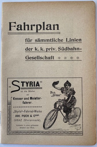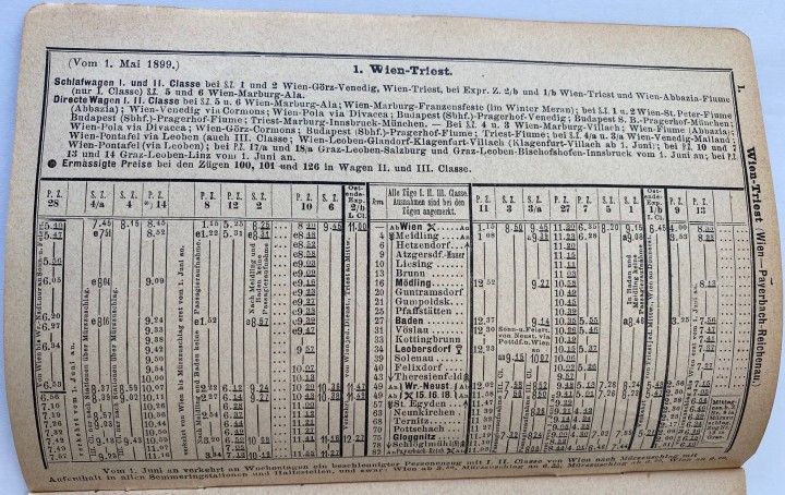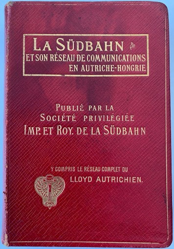 Vor kurzem wurde der französischsprachige, ebenfalls von der K.K. Priv. Südbahngesellschaft herausgegebene Reiseführer “La Südbahn et son réseau de communications en Autriche-Hongrie” (datiert auf 1899) in einer Luxusausgabe in rotem Ziegenleder mit Goldprägung und mit Goldschnitt erworben, welcher der “Fahrplan für sämmtliche Linien der K.K. Priv. Südbahn-Gesellschaft” vom 1. Mai 1899 beiliegt, der in unserem Exemplar der entsprechenden deutschsprachigen Ausgabe “Die Südbahn und ihr Verkehrsgebiet in Österreich-Ungarn” fehlte.
