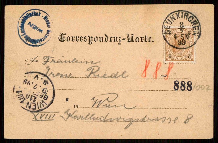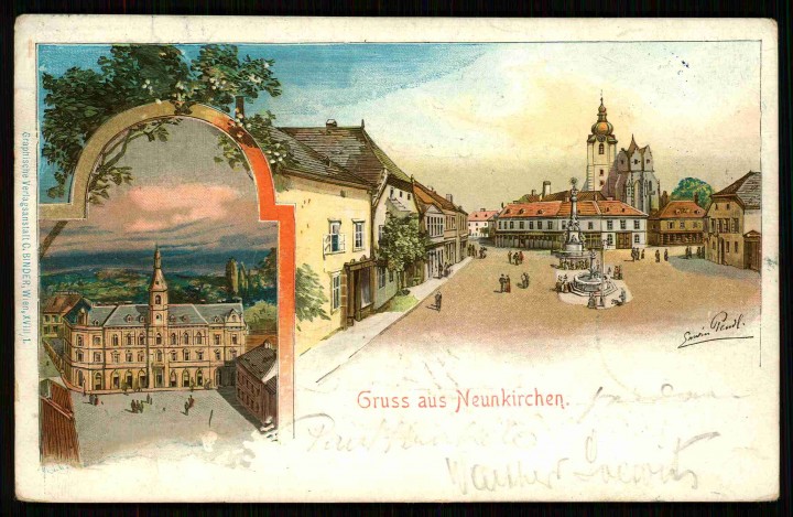 Aus dem reichhaltigen Fundus der NÖ Landesbibliothek haben wir – mehr oder wenig zufällig - die hübsche Ansichtspostkarte „Gruss aus Neunkirchen“ des Wiener Vedutenmalers Erwin Pendl (1875-1945) ausgesucht, die im Jahre 1899 ihren Weg zu einem Fräulein Irene Riedl in Wien XVIII., Karl-Ludwig-Straße 8, angetreten hat. So hat die Straße 1881-1920 geheißen, seither trägt sie den Namen Weimarer Straße