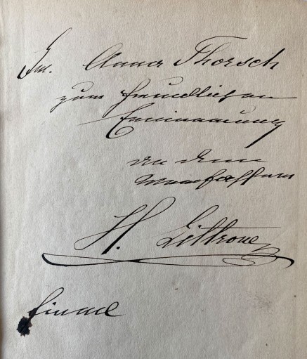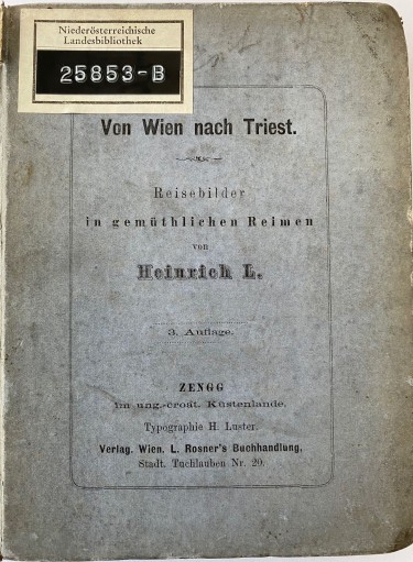So reimte Heinrich von Littrow (1820-1895) im Vorwort seines Büchleins “Von Wien nach Triest – Reisebilder in gemüthlichen Reimen”, welches er der Gräfin Anastasia von Wimpffen (1838-1889) widmete. Die 1874 in Wien in L. Rosners Buchhandlung erschienene 3. Auflage wurde von Hubert Luster (1833-1892) in Zengg (Senj) gedruckt. Auf dem Vorsatz unseres Exemplars befindet sich ein Autograf von Heinrich Littrow (Widmung für Anna Thorsch, wohl die Mutter von Alfons Thorsch).