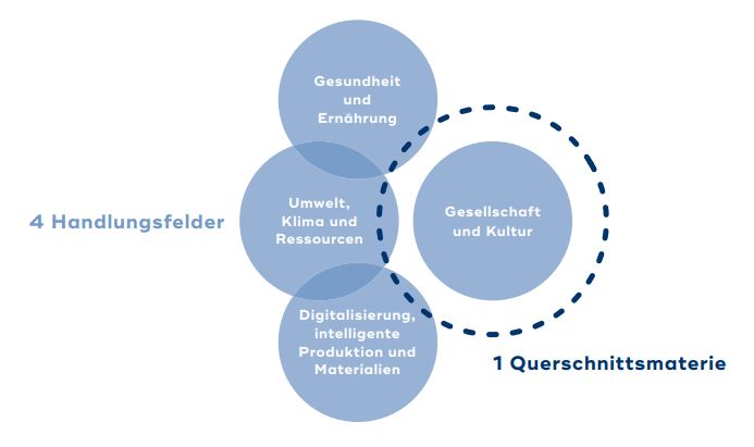 Das Handlungsfeld „Gesellschaft und Kultur“ nimmt in dieser Struktur eine Sonderstellung mit einer zweifachen Funktion ein: Es soll einerseits als eigenes Handlungsfeld geistes-, sozial- und kulturwissenschaftliche Fragestellungen beleuchten, und andererseits als Querschnittsmaterie zu den anderen Handlungsfeldern dienen. Neben naturwissenschaftlich-technischen Fragen sollen so auch verstärkt gesellschaftliche Perspektiven und Rahmenbedingen der anderen drei Themenbereiche in den Blick genommen werden.